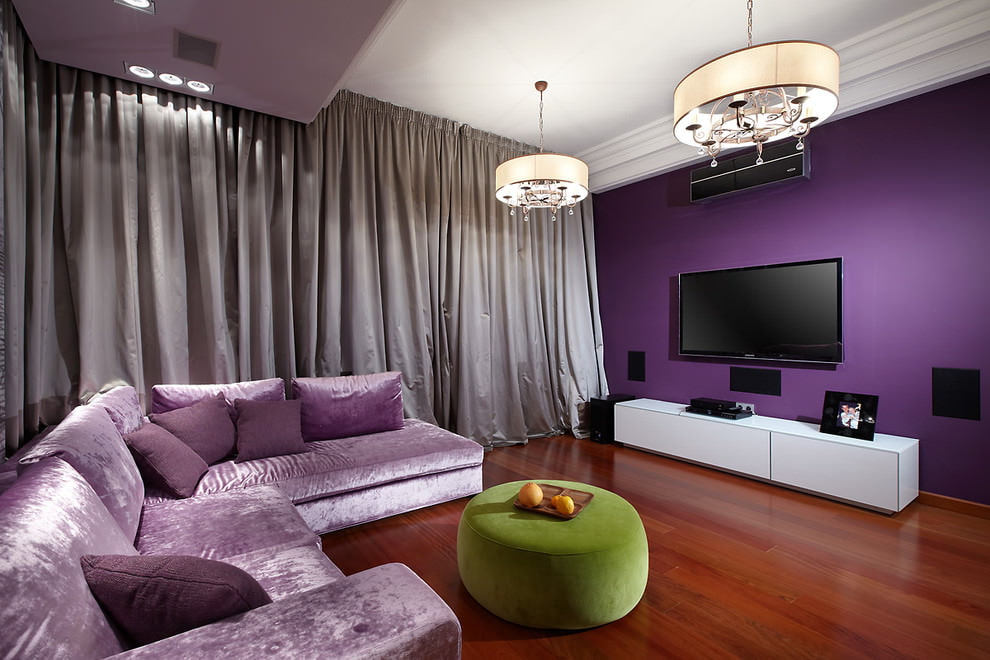 Фиолетовый цвет будет невероятно уместным в интерьере гостиной, где уникальность оформления комнаты может быть подчеркнуты обивкой мебели, диванными подушками, портьерами, отделкой или элементами декора.