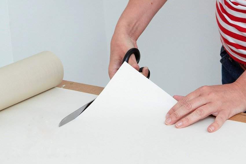Перед проведением основных работ рулонные материалы разрезают на полосы, длина которых соответствует высоте стены плюс запас в 5–10 сантиметров. Для большей точности высоту комнаты проверяют в разных местах. В случае совпадения размеров нарезают несколько полос, суммарная ширина которых позволяет перекрыть всю плоскость стены.