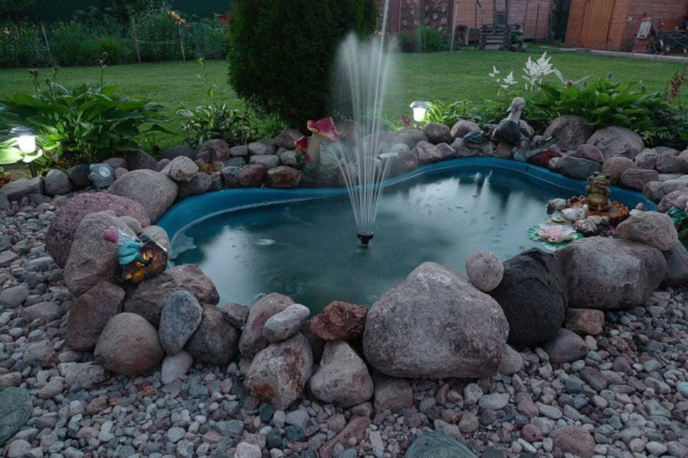 Основой выступает присутствующий на дачном участке водоем. Движение воде придает насос, благодаря которому она поступает в трубу, оборудованную насадками, формирующими форму и направление струи.