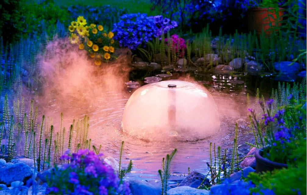 Безопаснее использовать надводную подсветку: светильники и прожектора, освещающие поверхность чаш, водные струи. Для таких систем подходят светодиоды, отличающиеся низким уровнем электропотребления, удобством и надежностью в работе. Чтобы создать туманный эффект, в комплексе монтируют диффузор.
