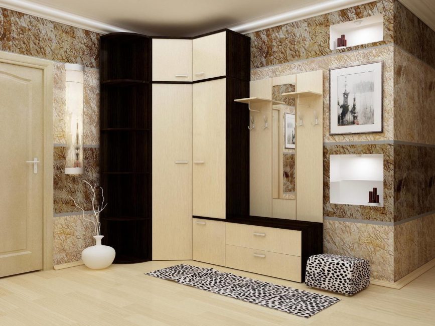 Чтобы пространство прихожей выглядело визуально шире, можно установить угловую прихожую, которая займет пустой угол, тем самым расширив границы используемого помещения
