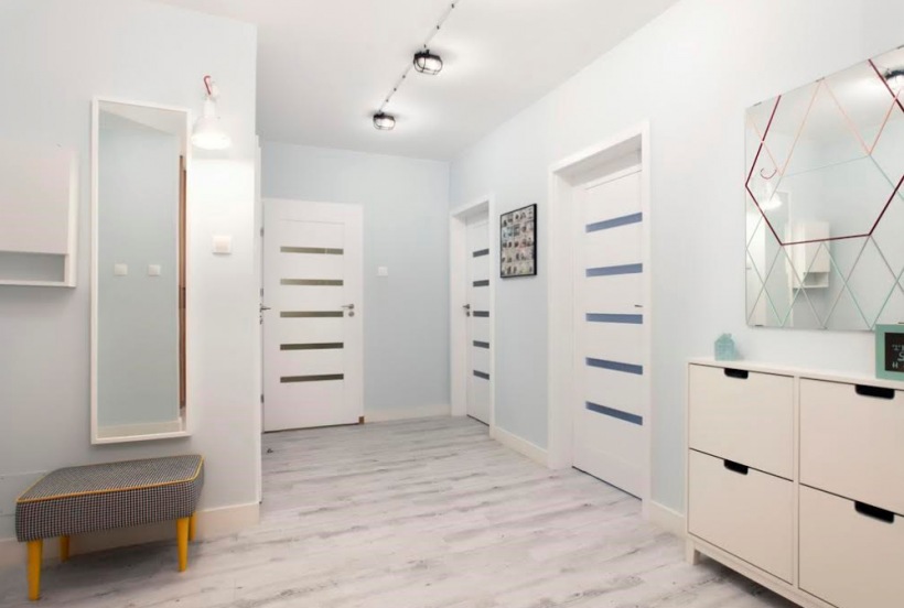 В современный небольшой коридор также стоит добавить больше света, тем более что в нем обычно нет окон. Тем не менее, есть простой способ сделать это. Двери, ведущие в соседние помещения, должны быть застеклены. В результате комната будет ярче, а значит и будет казаться больше.
