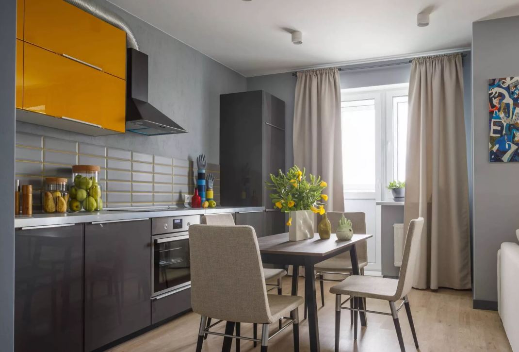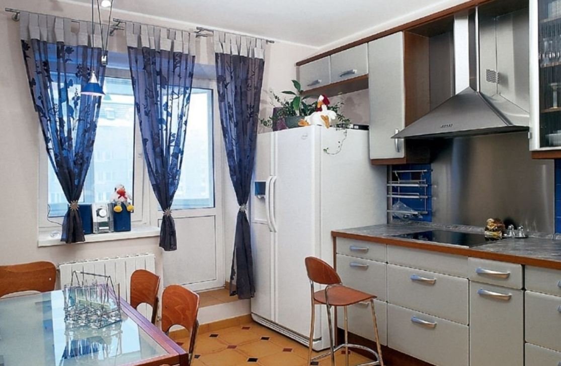 Классическое кухонное пространство имеет квадратную или прямоугольную форму. Из этого следует, что балконная дверь зачастую расположена напротив входа в кухню. Такая планировка считается приемлемой и позволит выбрать шторы для проема. В будущем они не станут мешать свободному перемещению по кухне.