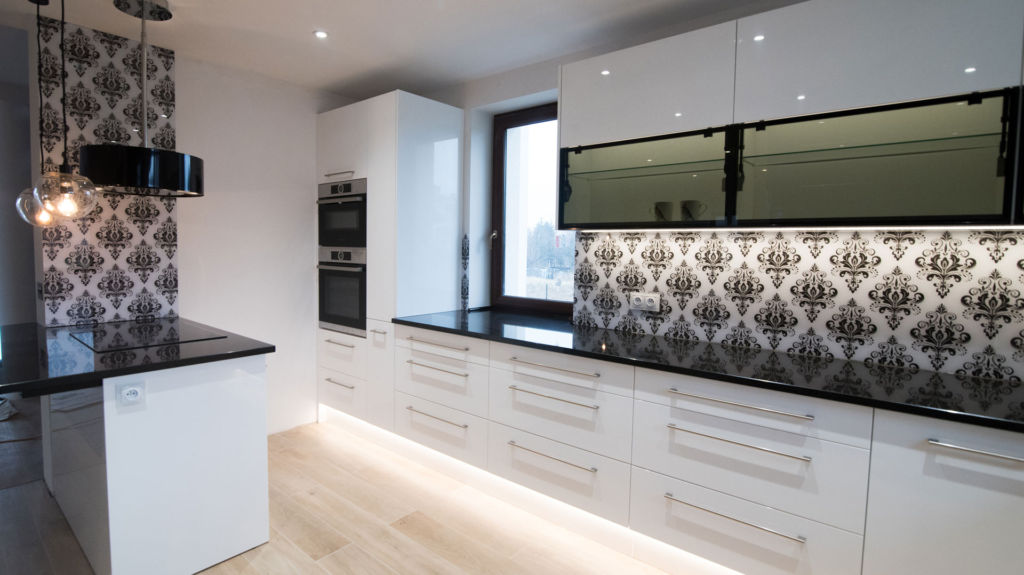 В местах, особенно подверженных воздействию брызг воды и жира, например, над плитой, вы также можете прикрепить стеклянную панель к полосе обоев, которая обеспечит дополнительную защиту стен.