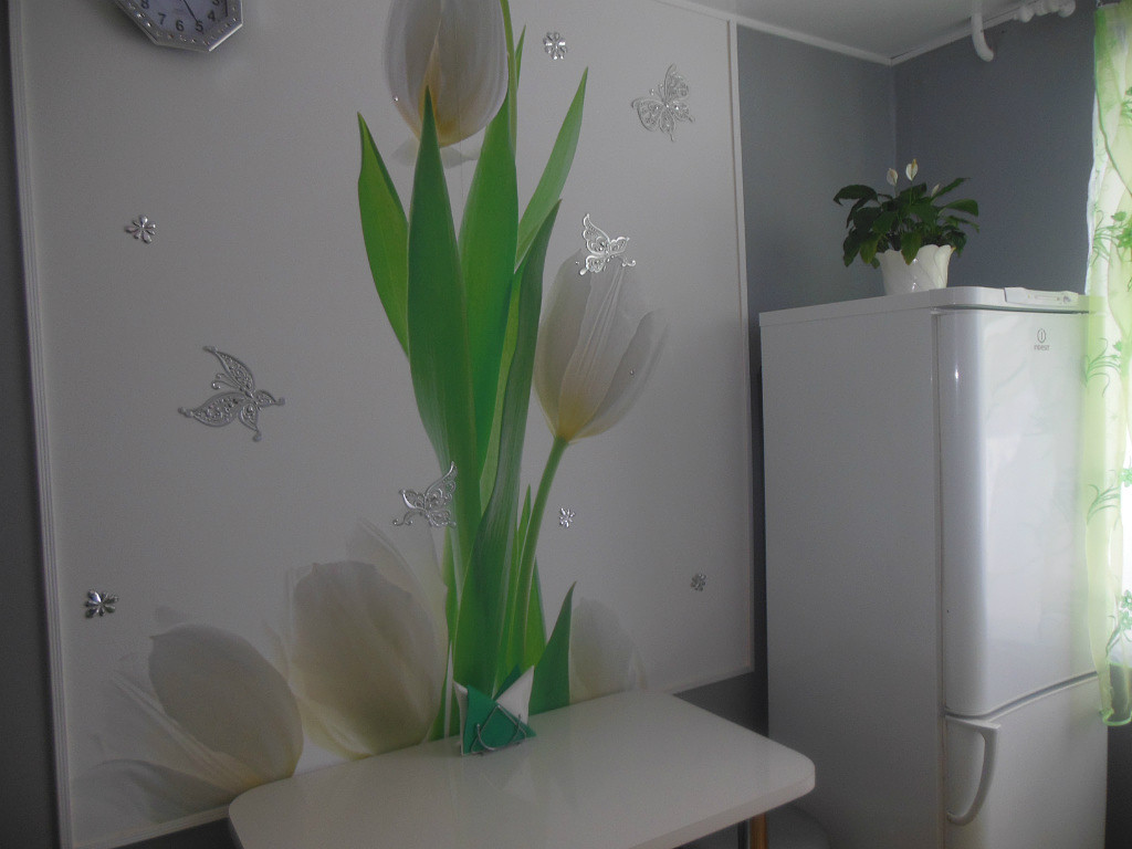 Также универсальны изображения цветов, особенно если вы используете кухонные гарнитуры ярких оттенков.