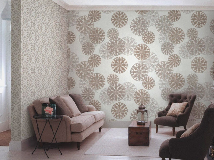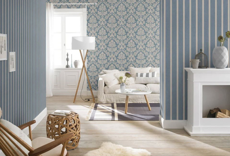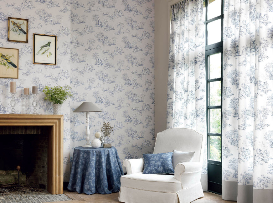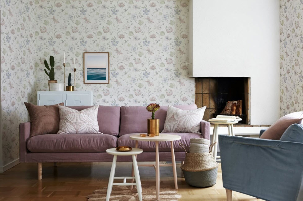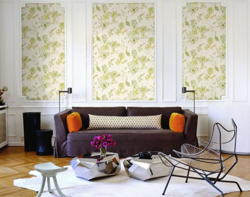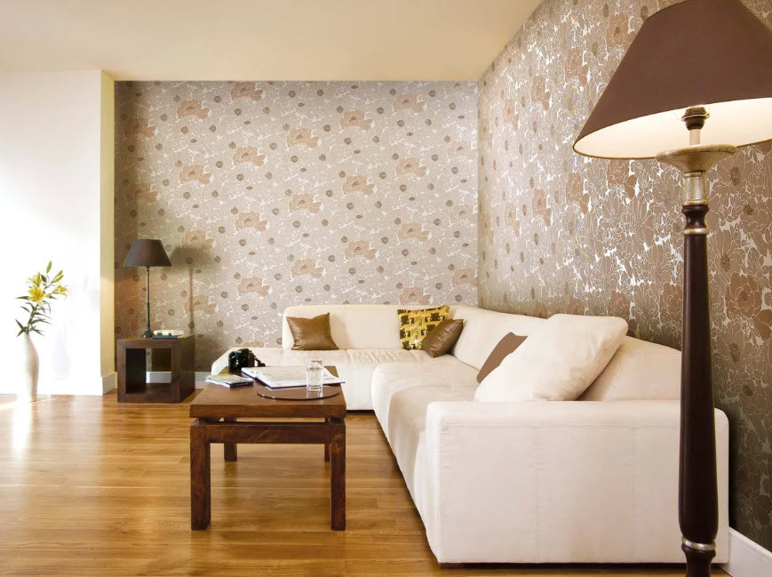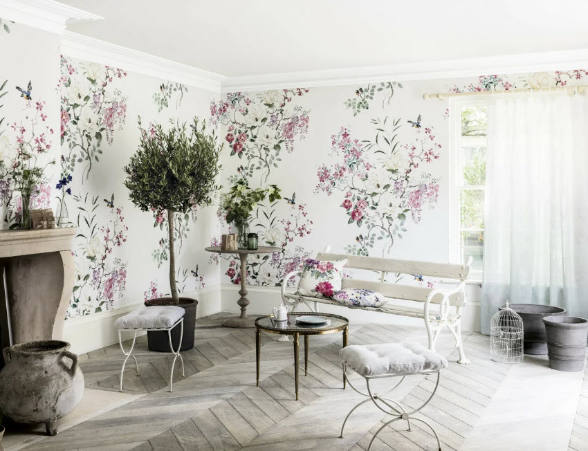 Мотивы растений подходят практически к каждой комнате, они очень универсальны. В маленькой гостиной вы будете в восторге от тонких рисунков в светлых расцветках, таких как нежно-голубой или бежевый. Если вы боитесь, что подобная отделка станет доминирующим элементом дизайна интерьера, хорошим решением будет использовать ее только на одной из стен.