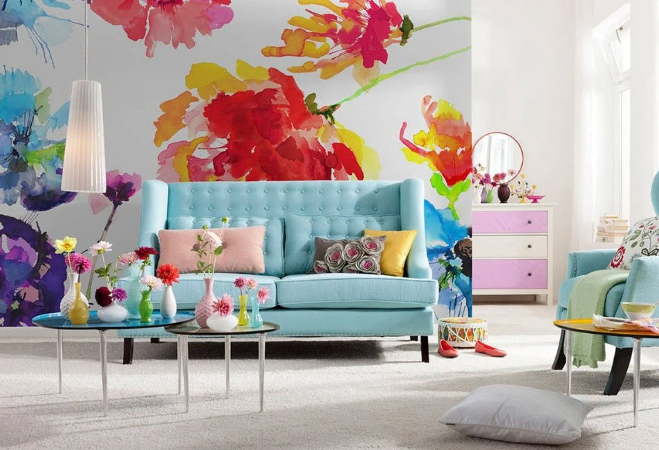 На самом деле, нет разделения, какие цветочные темы больше подходят для гостиной и спальни. Эта отделка стен также появляются на кухне и в ванной. Тем не менее, стоит попытаться сделать цветочный мотив настолько мягким, насколько это возможно в спальне, с плавными линиями и приглушенными цветами. Принт должен успокоить вас, а не стимулировать к активности. Масштабные цветы будут хорошо работать в ванной комнате.