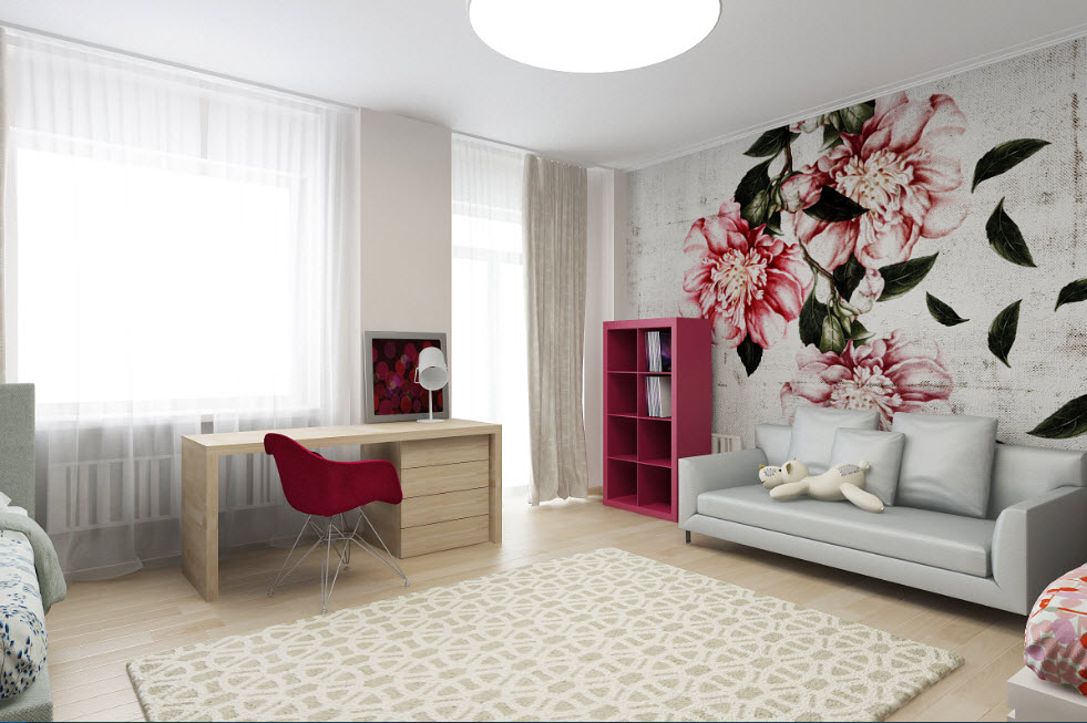Ярко-красные распустившиеся бутоны над кроватью – замечательный вариант для спальни, особенно для молодоженов. Красный цвет символизирует пылкую и страстную любовь. Одновременно с этим, великолепный яркий цветок играет роль акцента. Господствующий цвет в интерьере должен быть нейтральным: например, отделочные материалы и спальный гарнитур, серого или белого оттенка. Розовые цветы создают атмосферу романтики, что тоже вполне уместно в спальне. То же самое касается и детской, которая также играет роль спальной комнаты для малыша. Розовый цвет приятно гармонирует с оттенками бежевого, серого или с тем же беспроигрышным белым цветом. Этот вариант подойдет для тех, кому не нравятся резкие контрастные тона.