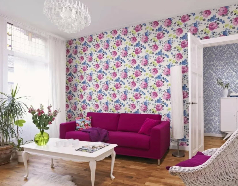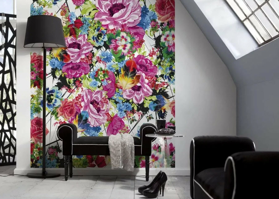 Кроме цвета и размера цветка, изображенного на обоях, нужно учитывать и тип помещения, в котором предполагается использовать данный элемент декора.