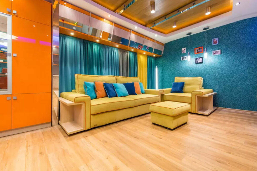 Декор подразумевает комбинирование, без него дизайн будет выглядеть разрозненным. Не стоит сочетать фотообои с цветами и с ярким рисунком на мебели. Всегда выбирают какой-то один акцент, придерживаются композиции. Если на обоях с эффектом фото роза, дерево, другой растительный узор, то для мебели выбирают либо нейтральную обивку, либо мелкий узор на нейтральном фоне.