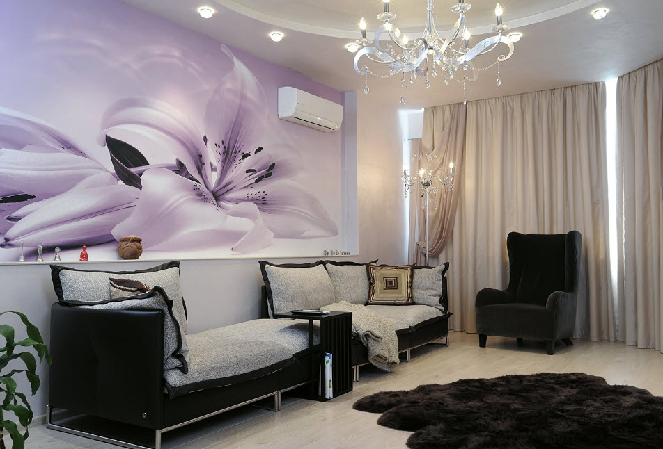 - Если у вас нет опыта декорирования интерьера, эксперименты – это не ваш путь. Беспроигрышный вариант — преобладание светлых оттенков в отделочных материалах, текстиле и мебели. В этом случае, уместно изображение цветка любого оттенка и размера;