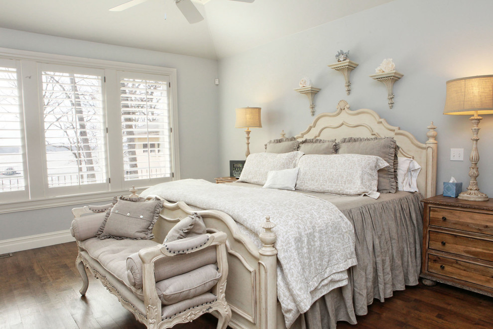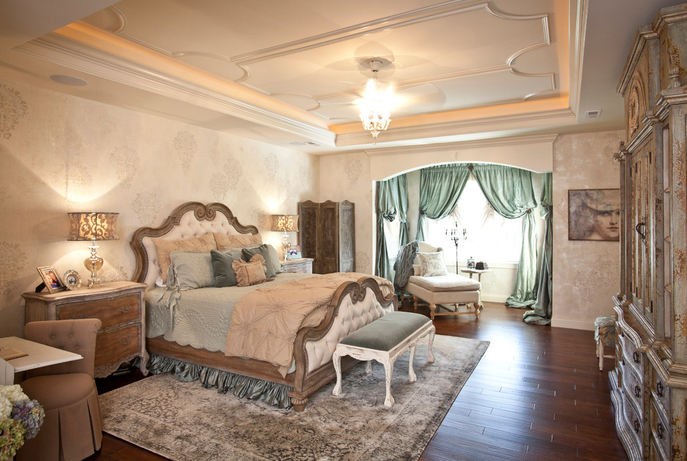 Французская спальня — царство мягких форм, изящных линий. Подойдет визуально привлекательная, обтекаемая мебель, к примеру, широкая кровать с деревянным либо тканевым мягким изголовьем, комфортное кресло на оригинальных изящных ножках, прелестный пуф, туалетный столик в дополнении с антикварным зеркалом в шикарной раме. Не рекомендуется размещать слишком громоздкие предметы, чтобы визуально не урезать площадь спальни.