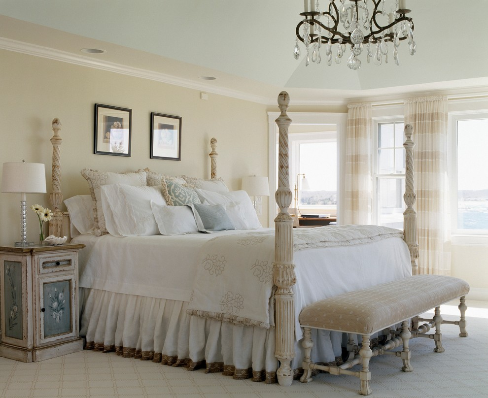 Мебельный ансамбль спальни дополняют прикроватные тумбочки, комод или будуар с большим зеркалом. У кровати обязательно необходимо разместить бра с изящными абажурами.