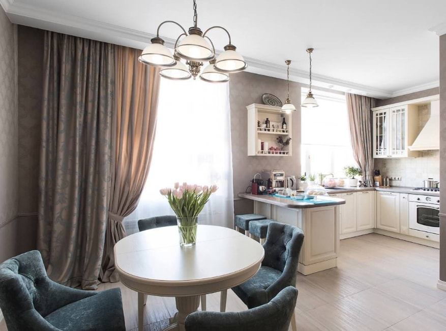 - классический – филенчатые фасады, натуральные материалы изготовления, допустимо небольшое количество резных элементов на мебели, лепнины на потолке, стенах. Допустимо наличие многорожковой люстры, столешницы из камня;