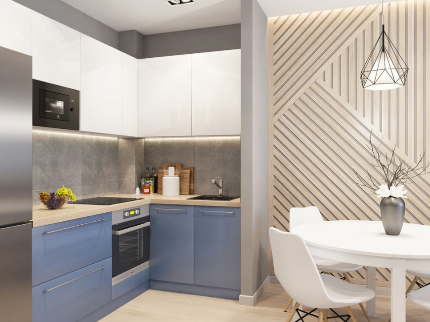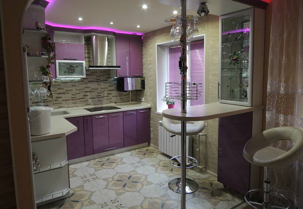 Самая универсальная считается угловая так называемая “Г” — образная кухня. Она удачно преобразит маленькую и проходную комнату. Появится удобная обеденная зона. В таком варианте — раковину, плиту и холодильник, должны находиться рядом, для увеличения рабочей поверхности.