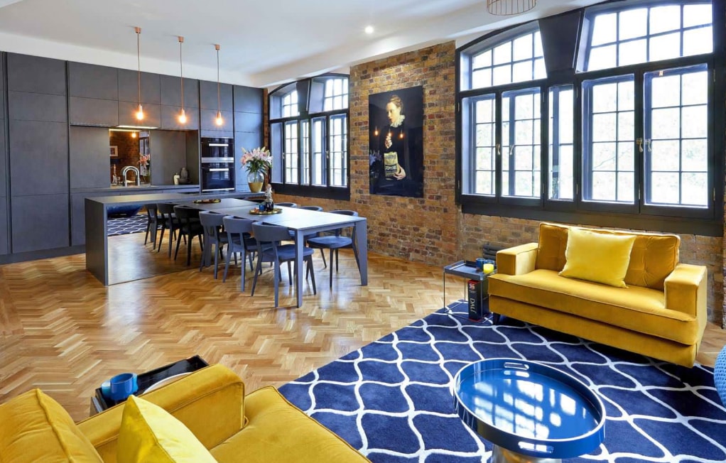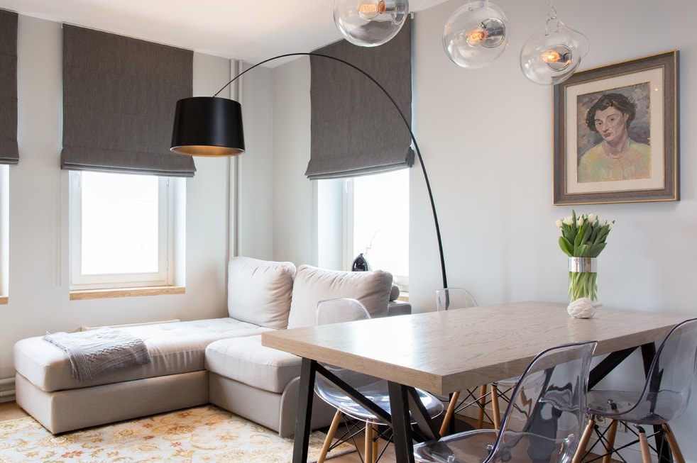 В большом помещении довольно часто для разделения пространства используют несколько элементов. К примеру большой обеденный стол и диван. Выглядит это очень органично, а общий вид при этом не перегруженный.