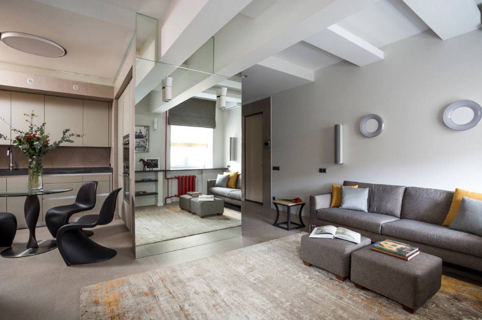 Принцип зонирования очень популярен в дизайнерской среде, в связи с тем, что разделение пространства осуществляется всеми возможными способами, кроме использования стены, что подразумевает интересные и нестандартные задачи и их решения.