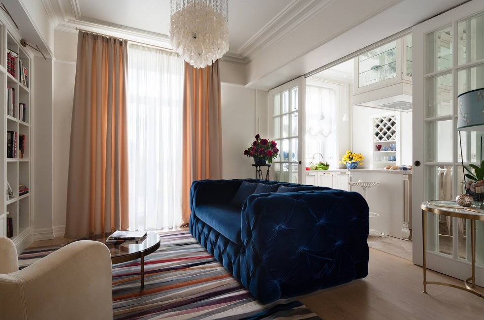 Светлая, белоснежная кухня-гостиная выглядит просто потрясающе. А объемный синий бархатный диван, как элемент визуального разделения, выглядит очень стильно и органично вписывается в общий дизайн. Это яркий пример того, что не стоит бояться экспериментов и непривычных решений.