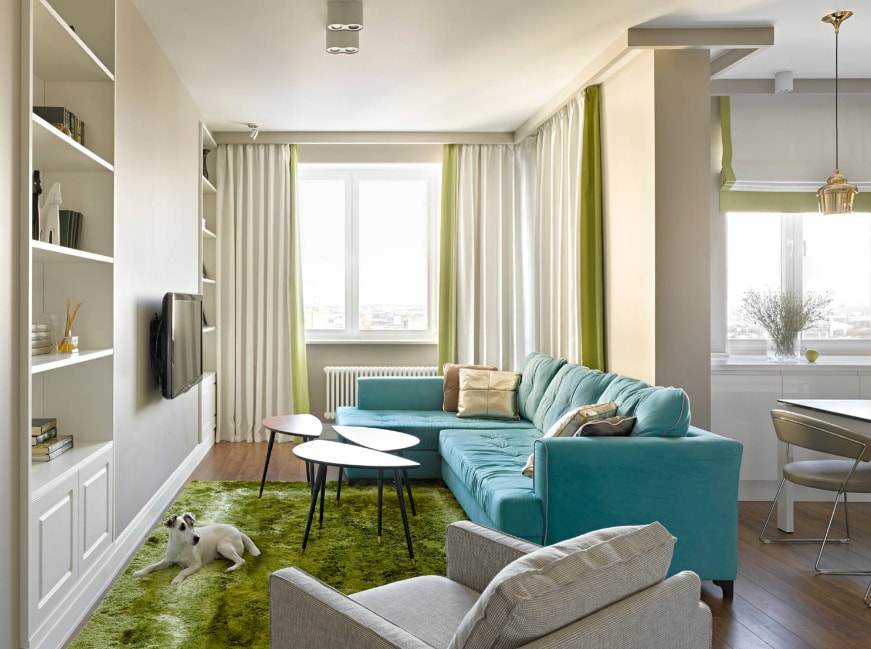 На фото расстановка мебели в узком пространстве
