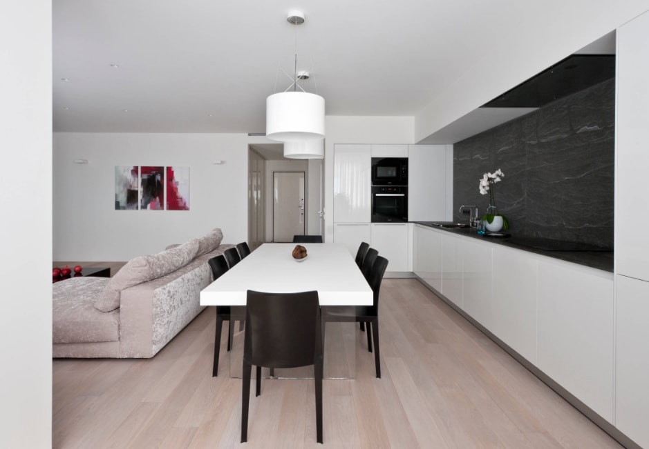 Таким образом можно даже зрительно увеличить пространство. Также очень часто чтобы дополнить такой интерьер, используют освещение над обеденным столом.