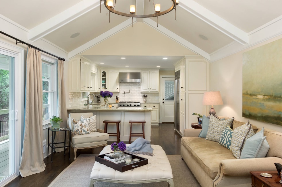 Потрясающий дизайн кухни-гостиной в одной цветовой гамме. А одинаковый узор как на стульях, так и на подушках делает его еще более стильным.