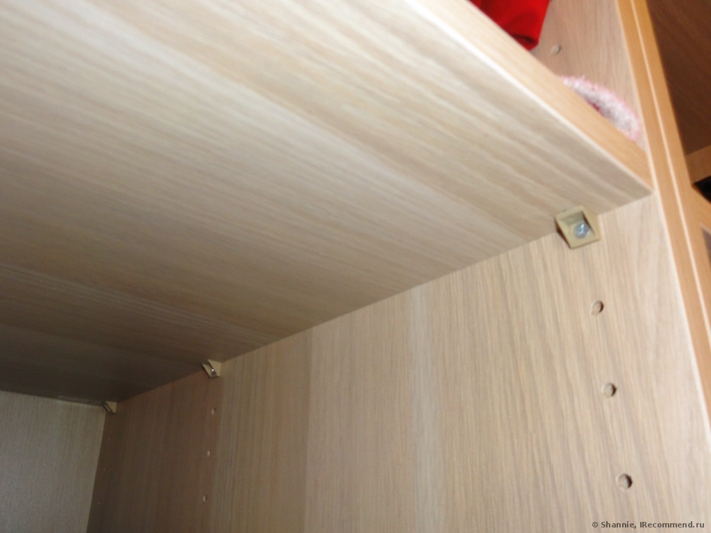 Отдав предпочтение саморезам, требуется предварительно просверлить в отмеченных местах отверстия. Если полки крепятся к деревянному основанию, то все монтируется непосредственно к стене. Если же нет, то в отверстия вставляются дюбели. Для закрепления металлических уголков используют короткие саморезы. Если для гардеробной планируются выдвижные полки, то к уголкам прикрепляют направляющие для роликового механизма.Чтобы крепежные элементы не выделялись их можно замазать шпаклевкой или скрыть под, наклеив декоративные накладки.