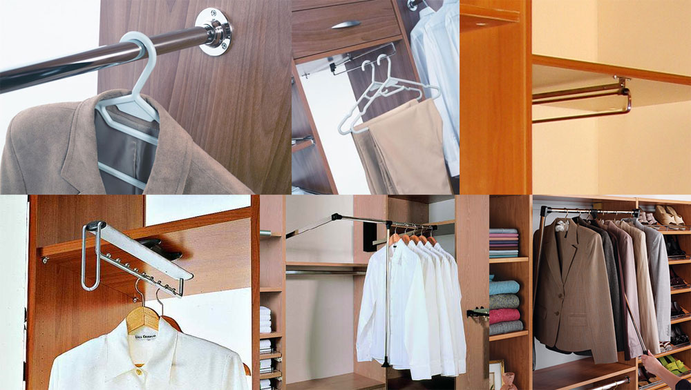 Монтаж штанги для одежды производят после того как внутри гардеробной установили полки. Крепежи приобретайте в магазинах, специализирующихся на мебельной фурнитуре, там легко выбрать самый подходящий вариант.