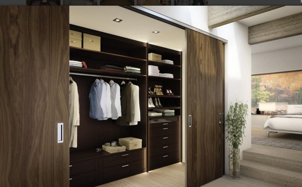| Двухсторонняя | ● удобная компоновка; ● возможность хранить много вещей | ● если нет возможности сделать дверь, открывающуюся наружу, то при открывании внутрь, она будет закрывать свободный доступ к вещам |