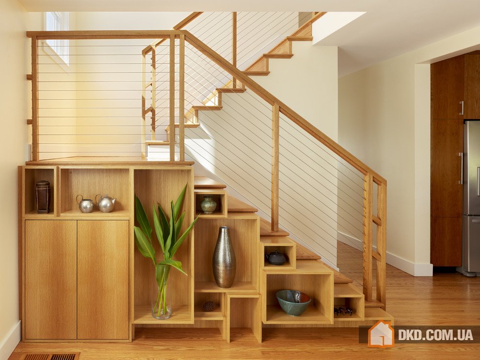Вертикальные и горизонтальные линии полок, дверей и ящиков совмещают с линиями ступенек и пролетов лестницы. Так будет смотреться естественно.