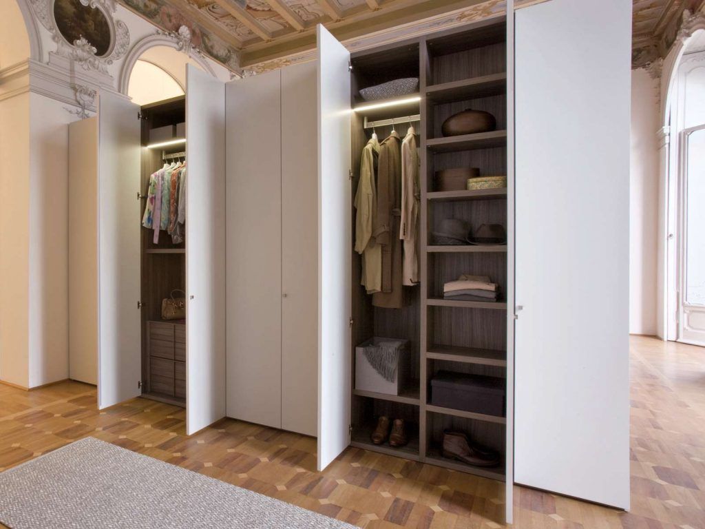 Двери распашные. Можно использовать, если в квартире достаточно много места, и под гардеробную выделена отдельная комната. Они занимают много места, но прекрасно вписываются в общий интерьер квартиры.