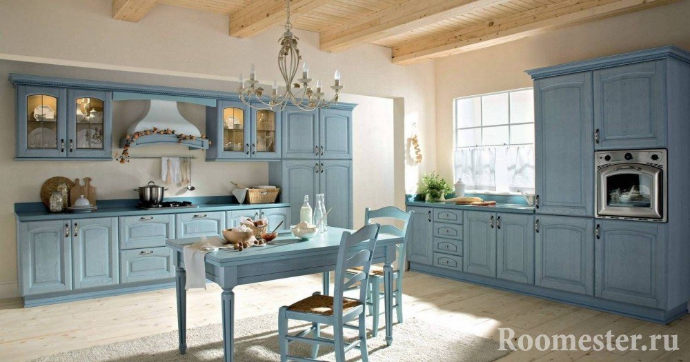 Корпусная голубая мебель уместна на кухне. Этот цвет подойдёт как для ультрасовременного пластика, так и для благородного дерева. Шкафы, кухонный фартук и столешница в тон, придадут кухне ощущение свежести.