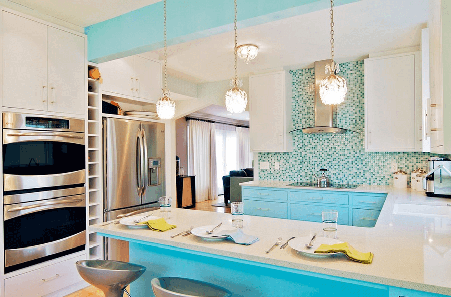 По мнению психологов, голубой цвет способствует улучшению аппетита и повышает настроение, поэтому в самый раз придётся для оформления обеденных зон.