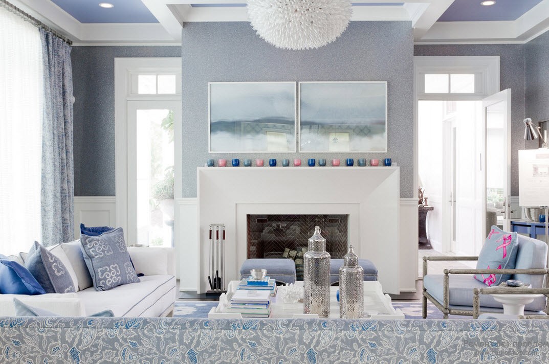 - Голубые обои, стремящиеся к ультрамарину, необходимо оттенить чуть более светлым потолком в той же цветовой гамме. Может подойти к этому цвету и розовый потолок, но здесь в интерьере придётся использовать насыщенные лиловые драпировки, занавески, декоративные подушки или покрывала.