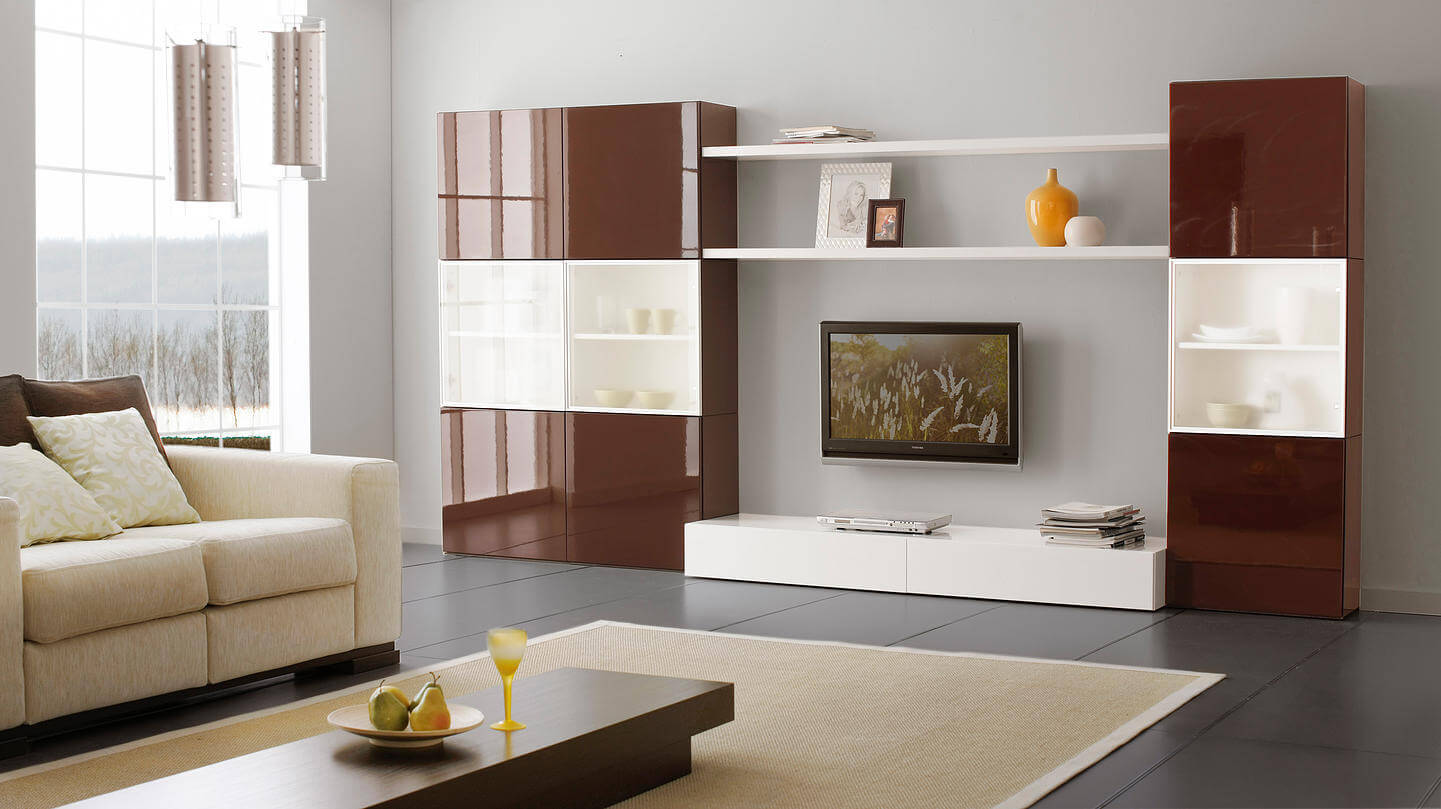 При выборе современной горки для гостиной, прежде всего важно определиться с функциональным назначением элементов. Для кого-то важно иметь как можно больше книжных полок, кому-то необходимо разместить фильмотеку и аппаратуру