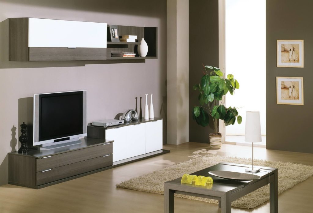 Минимальное наполнение комнаты является самым популярным направлением в современном исполнении. Цвета выбираются белые, черные, серые, бежевые. Стенка должна быть не броская, четко вписываться в общий интерьер. Основная часть мебельной конструкции должна быть закрыта от посторонних глаз.