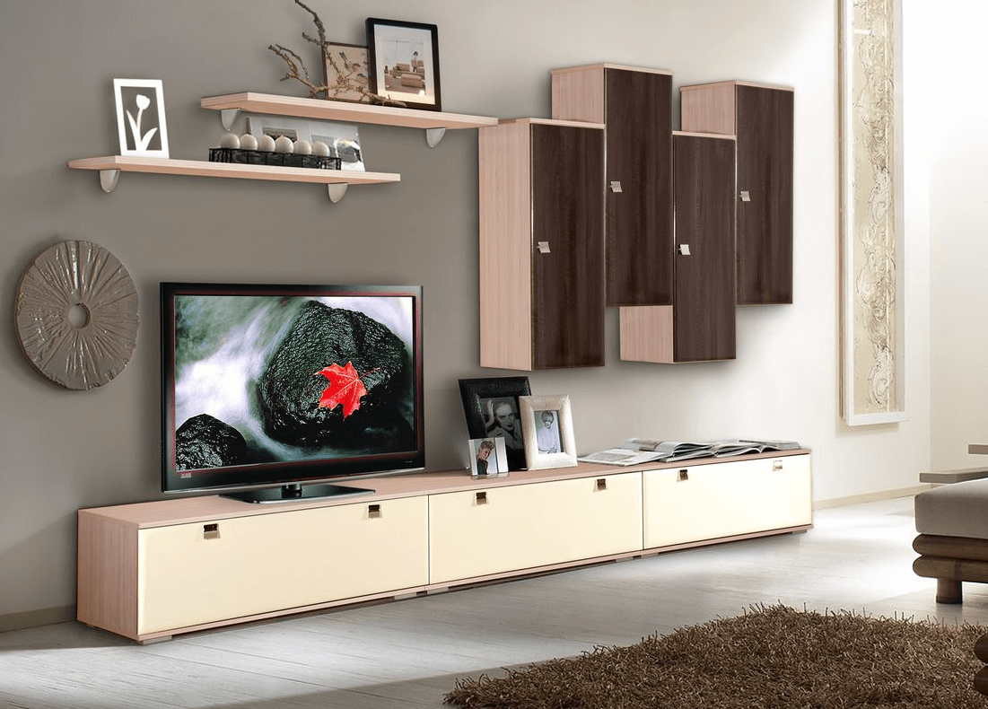 Прямые. Современные гарнитуры можно расположить по прямой линии, вдоль стены. Особенно выгодна подобная расстановка для квадратных и прямоугольных помещений. Часто компоненты линейной стенки-горки просто невозможно разместить так, чтобы они становились в угол. То есть, именно соединение модулей в определенной поочередности дает композиции завершенный и гармоничный вид и при изменении данного порядка нарушается внешняя целостность горки. Стандартный вариант прямой стенки предполагает наличие нескольких шкафов, открытые и закрытые полки, тумбочку для телевизора, которая является центром гарнитура. Элементы линейного комплекса располагаются симметрично. По бокам от центральной тумбы ставят самые высокие элементы, остальные расставляют по мере снижения к краям. Такая расстановка визуально делает комнату выше. Также при линейном расположении возможна расстановка высоких шкафов по краям, а в середину устанавливают телевизор на центральной низкой тумбе и над ним навешивают несколько полок.