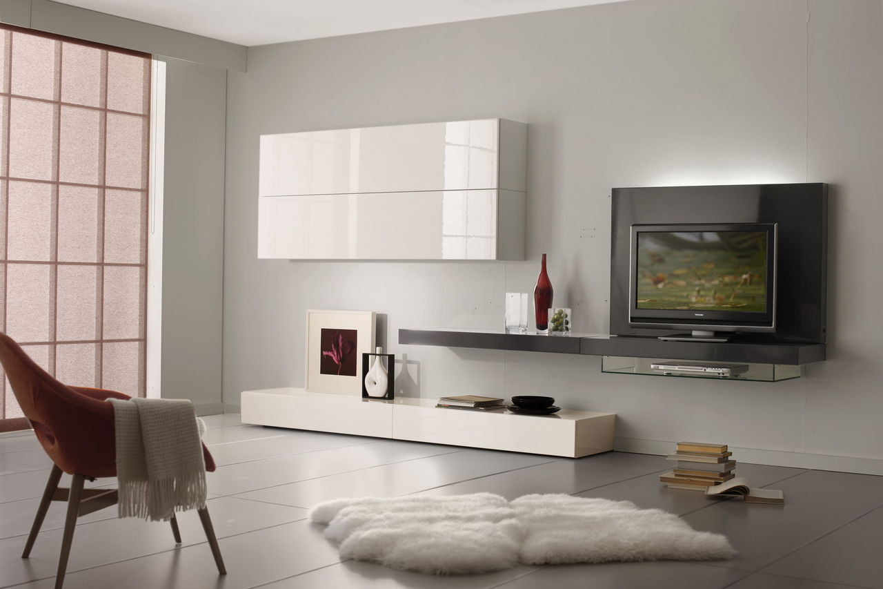 В этом стиле технические достижения не прячутся, а выставляются напоказ. Центральным элементом модульной стенки может быть телевизор или музыкальный центр. Минимум предметов для обозрения. Всё лишнее убрано в навесные шкафчики. Фасады шкафчиков и тумб это гладкие, ровные, матовые или полированные поверхности. Разделение зон осуществляется за счёт светлых и тёмных цветов фасадов.