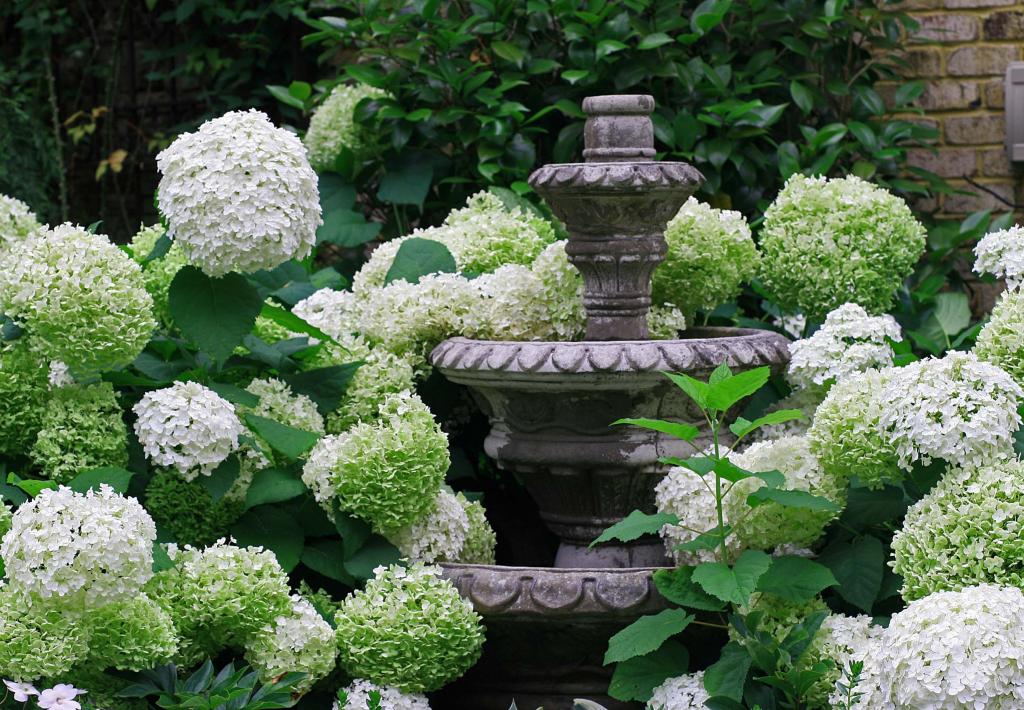 Пышная высокая древовидная гортензия отлично уживается в средних широтах. По мере раскрытия соцветия меняет оттенок с зеленоватого на белый или нежный кремовый. Из интересных сортов – розоватые Инвизибл Спирит, буйно цветущие Стерилис, крупные белоснежные Аннабль и Грандифлора.