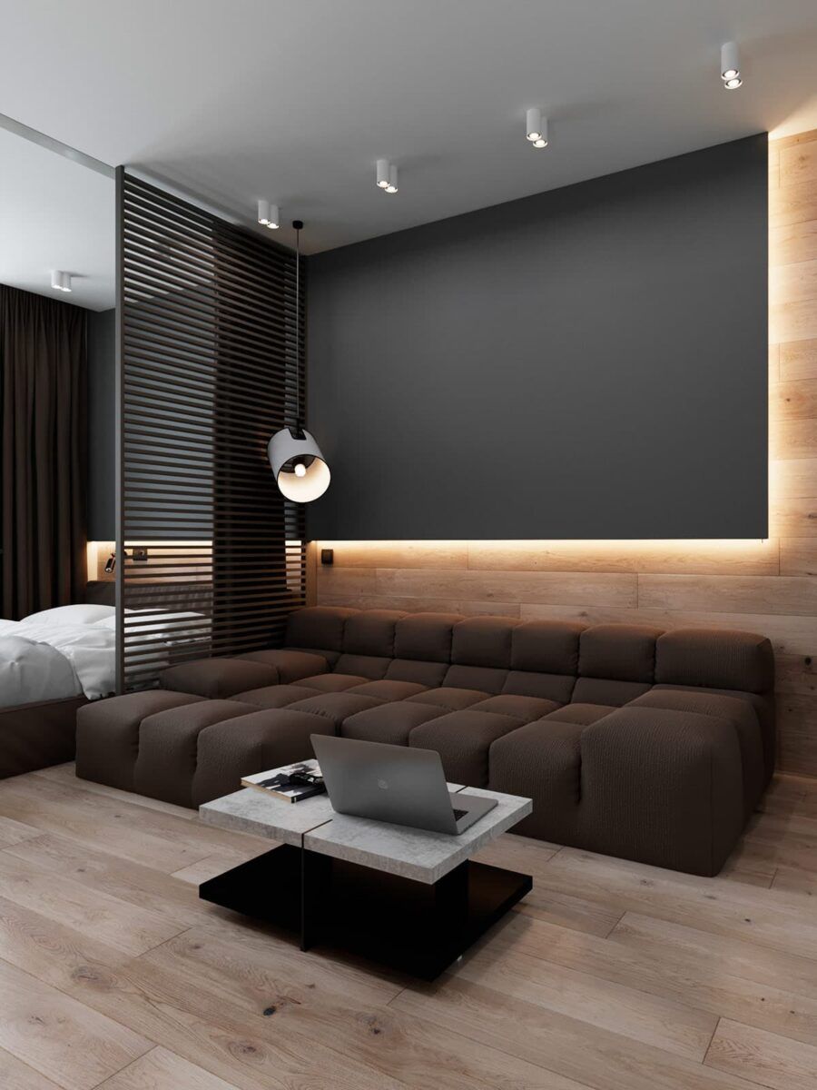 Спальня-гостиная 18 кв. м с высокими потолками в современном стиле