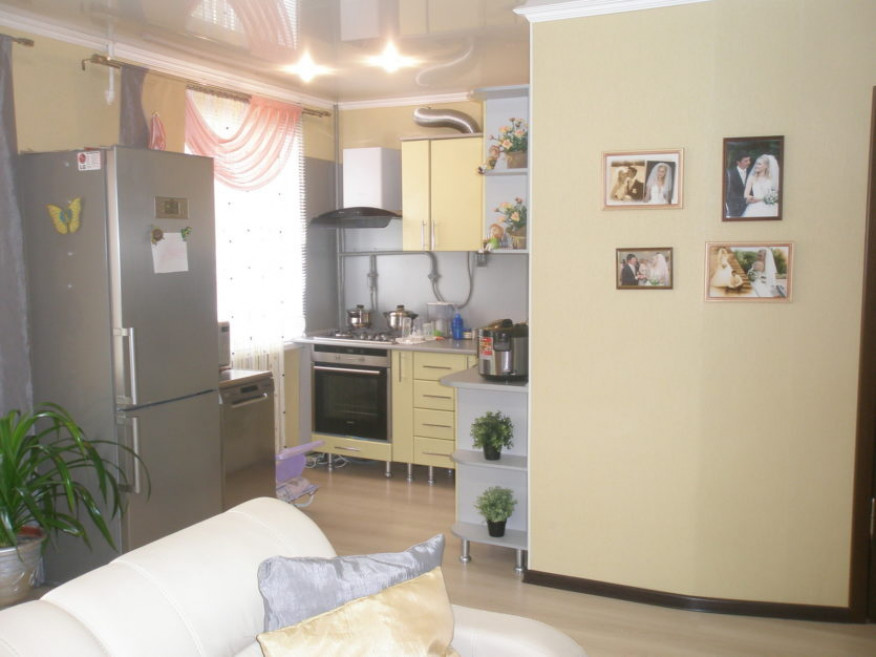 При перепланировке убирают не несущую стену. Для квартиры-студии устанавливают барную стойку или стеллаж, которые выполняют разделительную функцию. Кухонный гарнитур размещают вдоль стены напротив зоны для еды. Если нужно много бытовой техники, стол переносится в зону гостиной. На кухню-студию устанавливают мощную вытяжку, которая не позволит распределяться лишним запахам от приготовления еды. На фото можно увидеть дизайн в 2-х комнатной квартире: