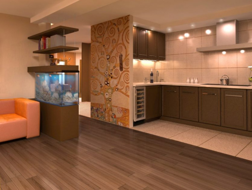Дополнить интерьер можно необычными деталями. Интересно смотрится аквариум в качестве зонирования или электрический камин. Визуально разделить пространство помогут также зеленые растения на этажерках. Объединение кухни и гостиной превращает хрущевку в стильное и современное жилье, наделяет его необходимым пространством для комфортной жизни.