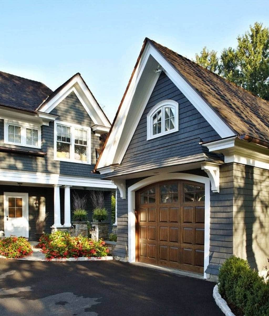 Нередко в наружном оформлении встречаются контрастные цветовые сочетания (оттенки белого и чёрного или тёмно – серого). Светлые стены великолепно смотрятся на фоне тёмной крыши и тёмных наличников, чёрной входной двери. Хотя стены могут быть и коричневыми, синими, зелёными, но это должны быть цвета, которые впишутся в окружающий ландшафт.