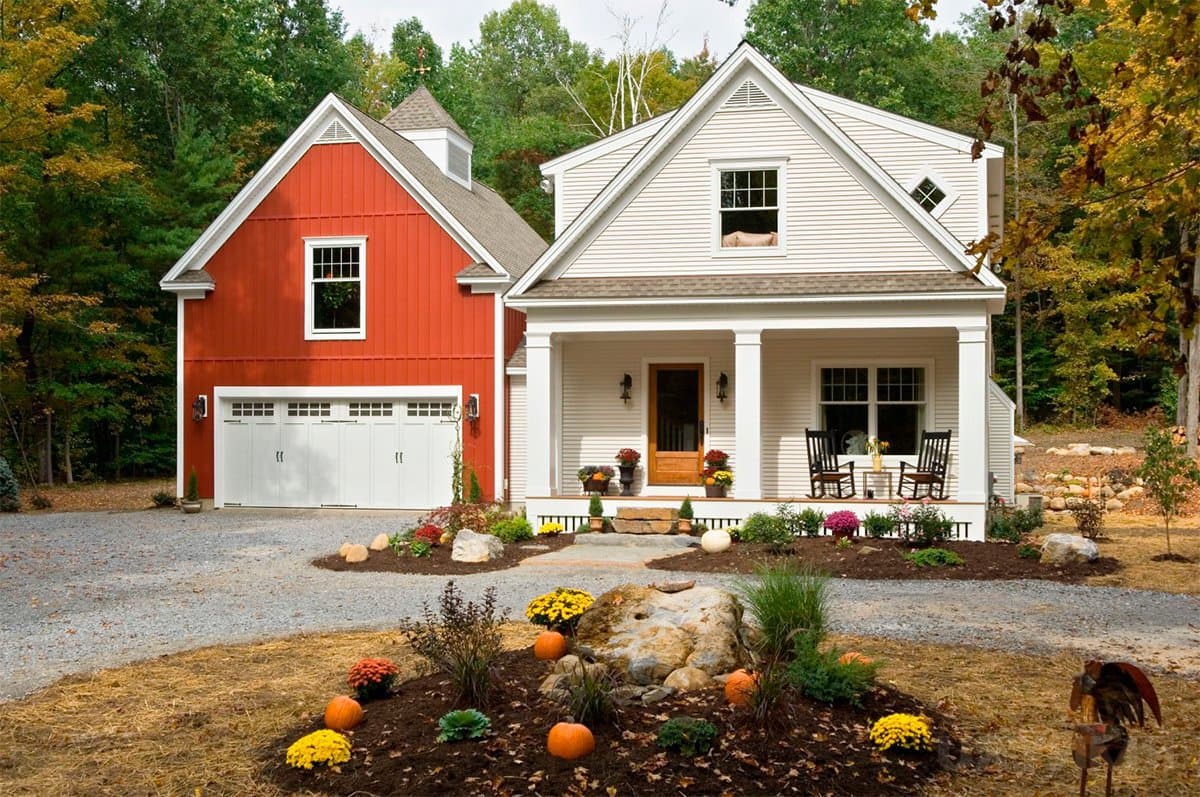 Красный фасад частного загородного дома отлично сочетается с белыми окнами