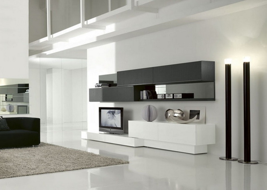 Конструкция меблировки должна быть практичной, поражать собственными формами, отличаясь при этом обычностью и функциональностью. Востребованными в настоящий момент являются модульные системы, которые более того можно оборудовать подсветкой. Совсем не уступают им и встроенные варианты купейных шкафов, сливающиеся со стенками. Гарнитур не должен захламлять пространство, благодаря этому большие и тяжелые композиции тут не уместны, необходимо предпочтение отдать глянцевым фасадам и хромированным деталям. Можно применять стеклянные интерьерные атрибуты – полки, кофейный столик, которые дадут легкость, воздушность обстановке.