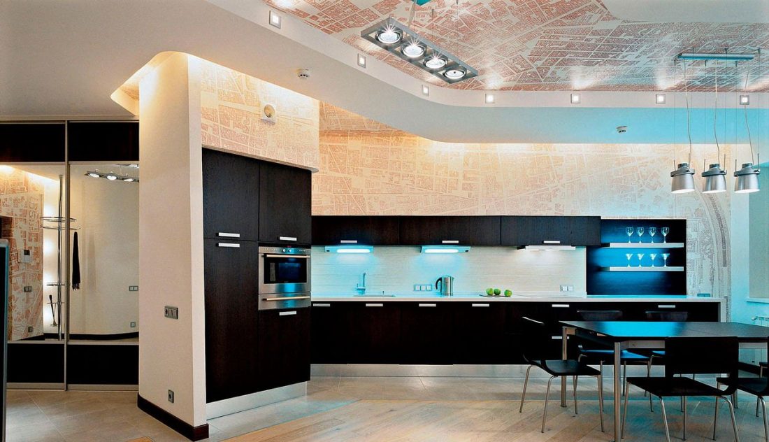 С точки зрения эстетики этого стиля дизайна верхнюю часть помещения позволяется вариативно оформлять: