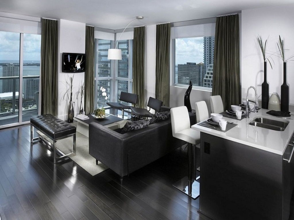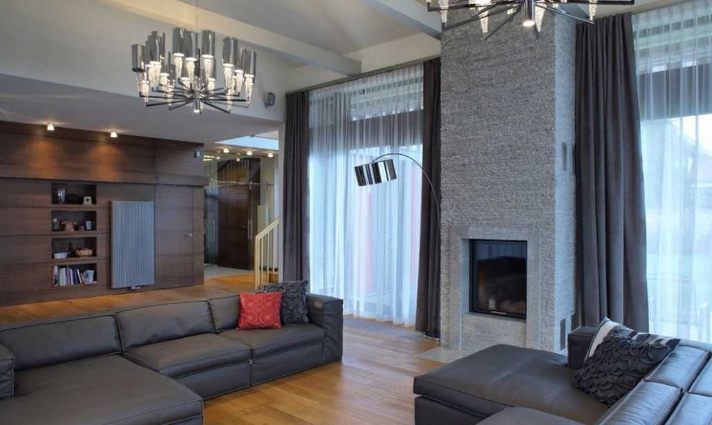 Очень часто встречается собственно подобное комбинирование. Причем к смоляной палитре можно отнести и оттенки серого, которые сделают логические переходы между контрастами. Ясно, что белизна зальёт главный фон, а черный проявит себя в остальных предметах обстановки. Это могут быть светильники, мягкий диван с кожаной угольной обивкой, фасады конструкций модульного типа, кофейный столик, темно-серые полотна завес на окнах. Порой сизо-черным оформляют поверхность пола, которая перетекает в серые панели находящиеся сбоку и белый потолок.