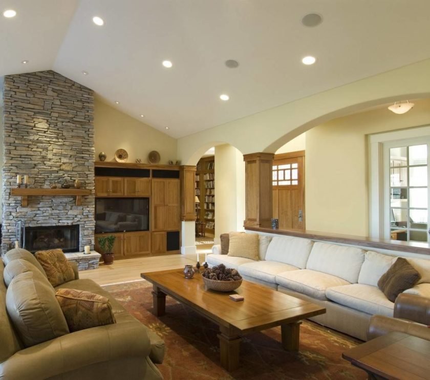 - Подойдет камин или его имитация в центре зала, это создаст дополнительный уют и оригинальность.