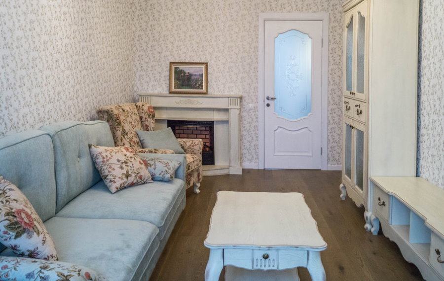 Чаще всего выбирают белый или кремовый. Будет уместным декор для мебели – немного ненавязчивой резьбы, присущей этому стилю, роспись, молдинги. Гостиная в хрущевке не может быть слишком заставленной. Здесь подойдут открытые полки, тумбы и стеллажи, на которые можно мелкие вещи складывать в плетеных корзинах. Это поможет скрыть с глаз накопление мелочей и поддерживать комнату в порядке. Даже у дивана можно поставить что-то наподобие табуретки с полкой под основной поверхностью, куда можно поставить корзину для пультов ДУ, зарядных для телефонов, очков и т.п.