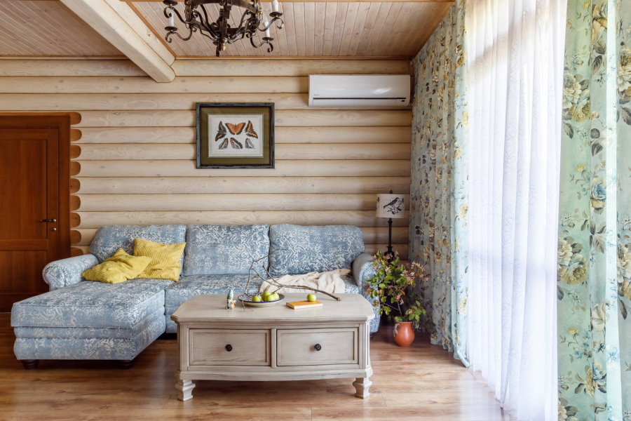 На фоне бревенчатых стен потрясающе будет смотреться мягкая мебель небесного цвета, дополненная белым тюлем и шторами с цветочным рисунком в тон дивана.