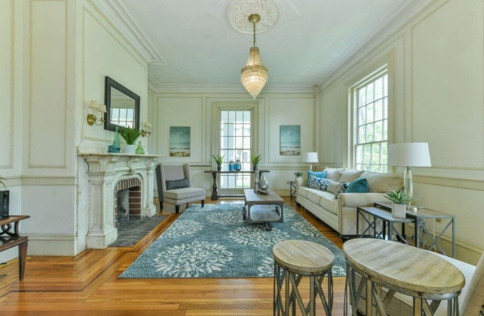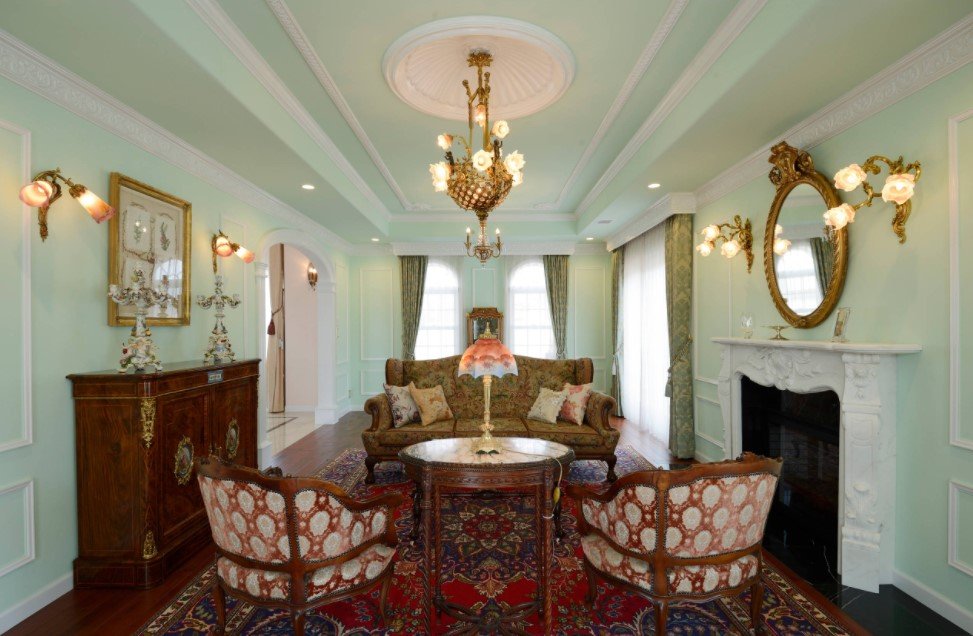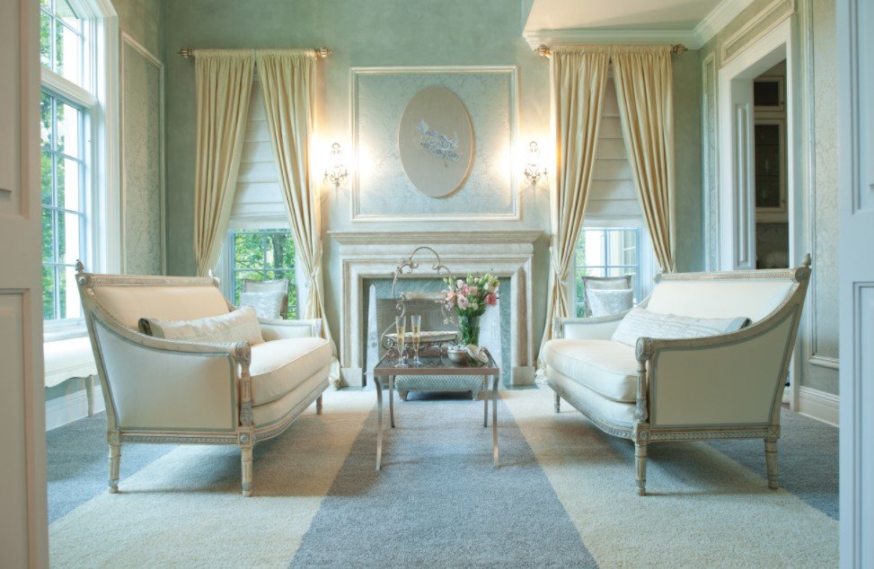 Классика. Стиль для ценителей роскоши, и здесь голубой должен использоваться вместе с бежевым, молочным или золотистым. На стенах просторных комнат вешают светлые полотна с оригинальным узором, а также используют молдинги и лепнину.